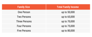 For families with 6+ persons, add $5,000 for each additional person to determine total family income thresholds.