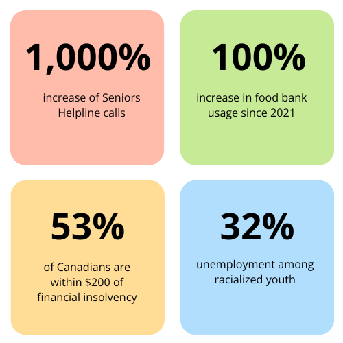 We are seeing increases in: homelessness, domestic violence, depression and anxiety, racism and hate crimes, youth unemployment, financial insecurity and insolvency, food bank usage, Isolation and loneliness of seniors.